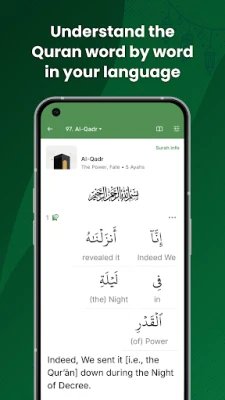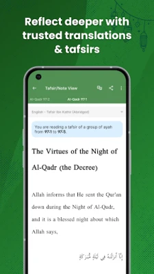 قرآن کے عمیق مطالعے کے لیے، یہ ایپ 65 سے زائد زبانوں میں 175 سے زیادہ تراجم اور تفاسیر فراہم کرتی ہے، جن میں اردو، ہندی، انگریزی اور دیگر زبانیں شامل ہیں۔ اس میں آٹھ مشہور عربی تفاسیر جیسے تفسیر ابن کثیر اور تفسیر طبری، نیز اعراب، لفظی معنی اور اسباب نزول کی تفصیلات بھی موجود ہیں۔ ہر سورہ کا جامع خلاصہ اور اس کی فضیلت جاننا بھی ممکن ہے۔ لفظ بہ لفظ ترجمے 15 سے زیادہ زبانوں میں دستیاب ہیں، جو آپ کو ہر لفظ کی جڑ، گرامر اور مورفولوجی کو سمجھنے میں مدد دیتے، اور قرآنی عربی سیکھنے کے عمل کو آسان بناتے ہیں۔ مصحف موڈ کے ذریعے مدنی، انڈوپاک اور دیگر مشہور خطاطی میں قرآنی نسخے کو پڑھنے کا وہی تجربہ حاصل ہوتا ہے جو ایک حقیقی مصحف سے حاصل ہوتا ہے۔