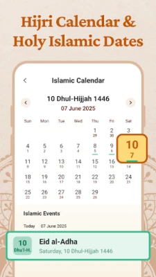 سلاۃ کا ہجری کیلنڈر آپ کو اہم اسلامی تاریخوں سے باخبر رکھتا ہے، جس سے مسلمان سال بھر کے اہم واقعات کو آسانی سے ٹریک کر سکتے ہیں۔ آپ ہجری اور گریگورین دونوں فارمیٹس میں تاریخوں کو دیکھ سکتے ہیں، اور دونوں کے درمیان آسانی سے تبدیل کر سکتے ہیں۔ مقامی چاند کی رویت کے مطابق ہجری تاریخ میں دستی ایڈجسٹمنٹ کی سہولت بھی دستیاب ہے۔ اس کے علاوہ، سلاۃ آپ کو قریبی مساجد تلاش کرنے میں مدد کرتا ہے جہاں آپ نماز ادا کر سکیں، کمیونٹی کے پروگراموں میں شامل ہو سکیں اور روحانی تعلق قائم کر سکیں۔ سفر کے دوران، آپ تصدیق شدہ حلال ریستوران بھی دریافت کر سکتے ہیں۔